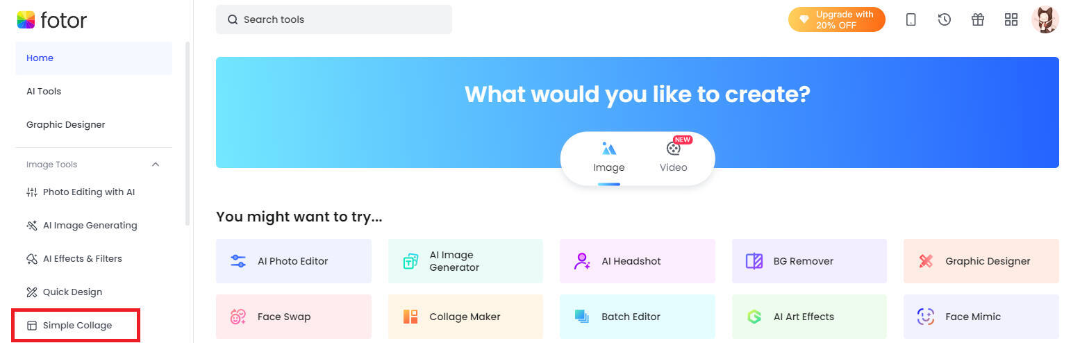 First off, you'll want to make an account--or generate one by linking a Google/etc account. Then you should end up on this page; if you don't, just head to www.fotor.com/design directly.