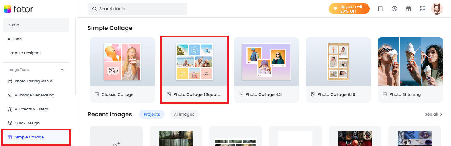 There's a few buttons on this page that say "Collage", but they don't all get you to the same place; Click "Simple Collage" on the SIDEBAR!From there, click "Photo Collage (Square)"; This will set you up for a square moodboard you don't have to edit the dimensions of!