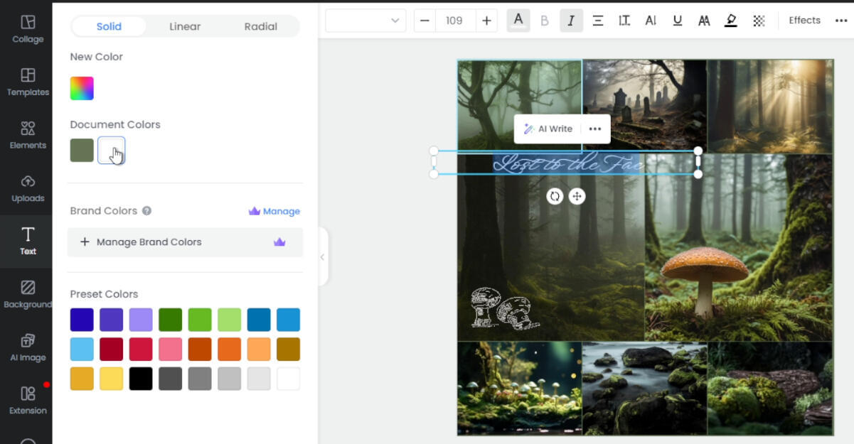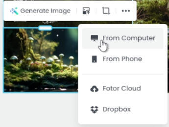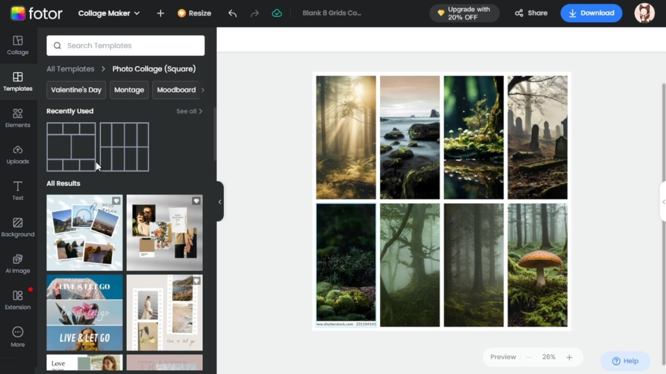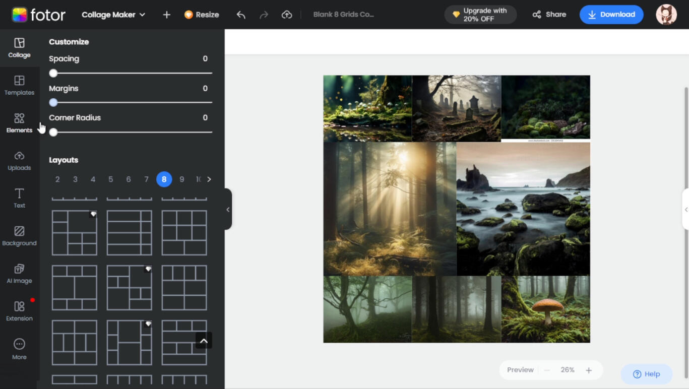 You'll be taken to this page, where you'll be able to upload your photos. If you haven't already, pause here and go collect some! A good quantity to aim for is around 4-12 images. These images should, when put together, contribute to the vibe and--in most cases--color scheme you're aiming for. I'll be making a generic moodboard for this tutorial, based on themes of a misty fey forest.When you've gathered the images you want, you can upload them directly onto the collage. For my demonstration, I ended up with 8 images total; Fotor sorted them very plainly, like this: