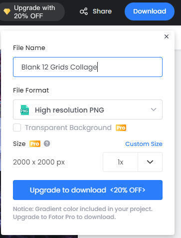 You'll know you successfully got rid of all the premium content if you click "Download" again, and that text at the bottom is gone! The blue button should also no longer prompt you to purchase premium, but should say "Download".The default settings for exporting from Fotor are perfect for our needs! 2,000 x 2,000 px is just right for the use of a moodboard. If you are completing a moodboard for one of the swaps I host, please do not change these settings! You will need to only submit a moodboard that is 2,000 x 2,000 px square.If you'd like to rename the file, you can do that here, as well. Otherwise, click "Download", and you're good to go!