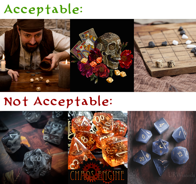 Moodboards should convey VIBES. None of the images in your moodboard should be dice themselves; it should not be treated like a pinterest board of dice you like. You can, however, just use images of dice as a thematic element.